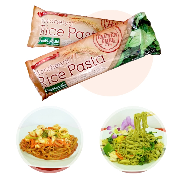 タイ国ハーモニーライフ農園で農薬と化学肥料を使用しないで栽培したモロヘイヤと玄米を使用したライスパスタです。