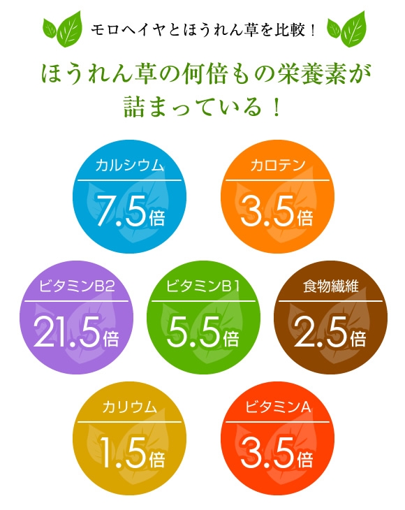 モロヘイヤは、βカロテンやビタミンA、ビタミンB群、鉄、カルシウムなどの栄養素がバランス良くぎっしり詰まっている、野菜不足の現代人の強い味方です。また、豊富な食物繊維がお腹をすっきりさせてくれるほか、妊娠前、妊娠中、そしてすべての女性に必要な栄養素である葉酸も多く含まれており、まさに万能な野菜といえます。
